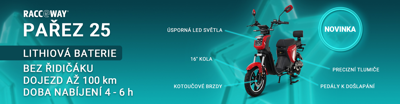 S týmto e-skútrom sa nemusíte obávať o vodičský preukaz a môžete vyraziť do ulíc s vetrom vo vlasoch. RACCEWAY® PAŘEZ 25 je ideálny pre tých, ktorí hľadajú slobodu a nezávislosť na pohyb po meste.